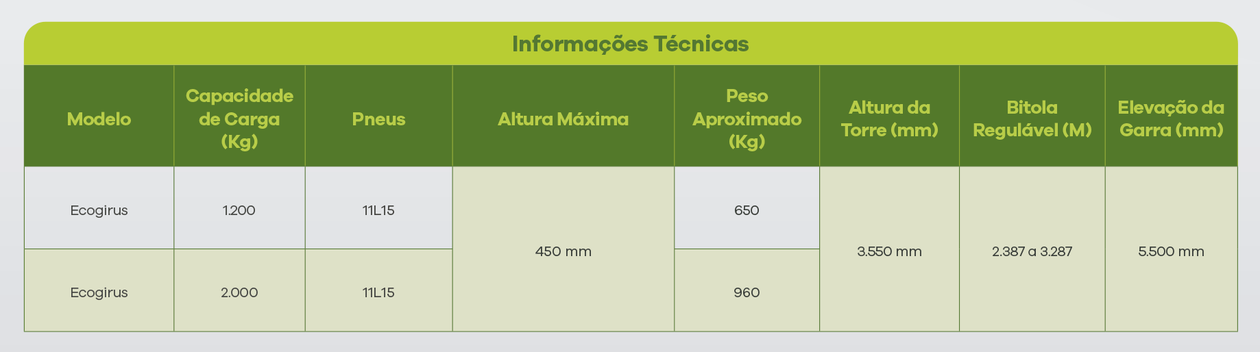 Possui duas configurações, de 1200 kgs ou 2000 kgs, e com uma altura de levante de 5.500 metros, o ECOGIRUS possui um ângulo de giro em sua lança de 120”, propiciando uma maior facilidade para trabalhos em espaços reduzidos.
