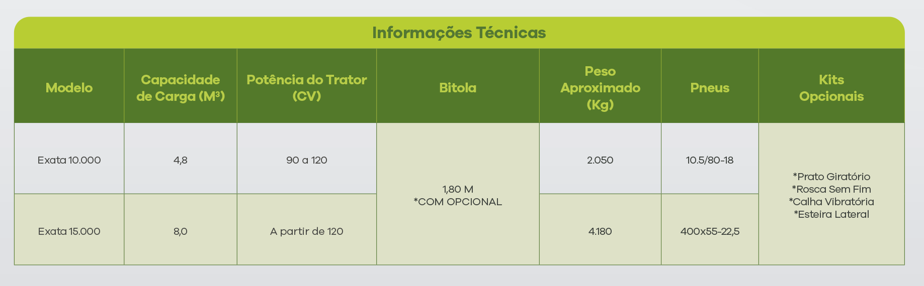 Estes modelos de carretas distribuidoras estão direcionados para aplicação de calcário, gesso e fertilizantes de um modo geral. Possui esteira de metal para transporte do material com largura de 500mm ou 800mm. A comporta para regulagem de distribuição do produto é feita através de um fuso tensor que confere uma regulagem mais precisa, com isso a certeza de estar aplicando a quantidade correta do produto. Todo acionamento é feito por sistema hidráulico, dispensando o uso de cardam, isso é possível graças a revolucionário sistema POWER TORQUE ECOAGRICOLA, que faz a redução através de engrenagens e correntes, ao invés do uso de redutores coroa e sem fim, assim saltamos de uma eficiência na casa de 50% dos redutores coroa e sem fim, para 97% no sistema POWER TORQUE ECOAGRICOLA. Isso se traduz em menor demanda do sistema hidráulico, e temperaturas mais baixa no óleo. Conjunto do rodado possui sistema tipo tandem.