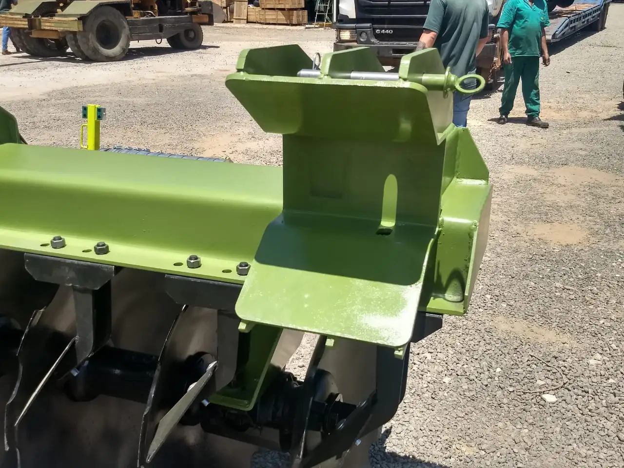 O cabeçalho possui sistema de articulação para facilitar o transporte. O deslocamento do equipamento é feito através do 3º ponto do trator, de forma angular, garantindo melhor eficiência e praticidade nas manobras.