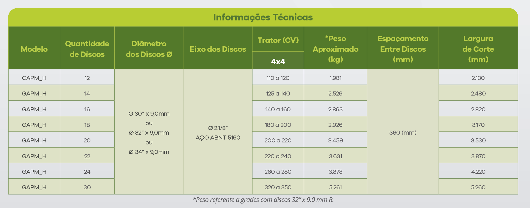 A Grade Aradora Pesada de Arrasto com abertura mecânica ou hidráulica (GAPM_H) foi projetada para ser utilizada no preparo de diferentes tipos de solo previamente cultivados ou abertura de novas terras destinadas ao plantio, fazendo este trabalho com qualidade e perfeição requeridas pelos agricultores de diversas culturas. Este modelo oferece ampla regulagem para ajuste de ângulo de corte da grade, com cilindro hidráulico e mecânico.