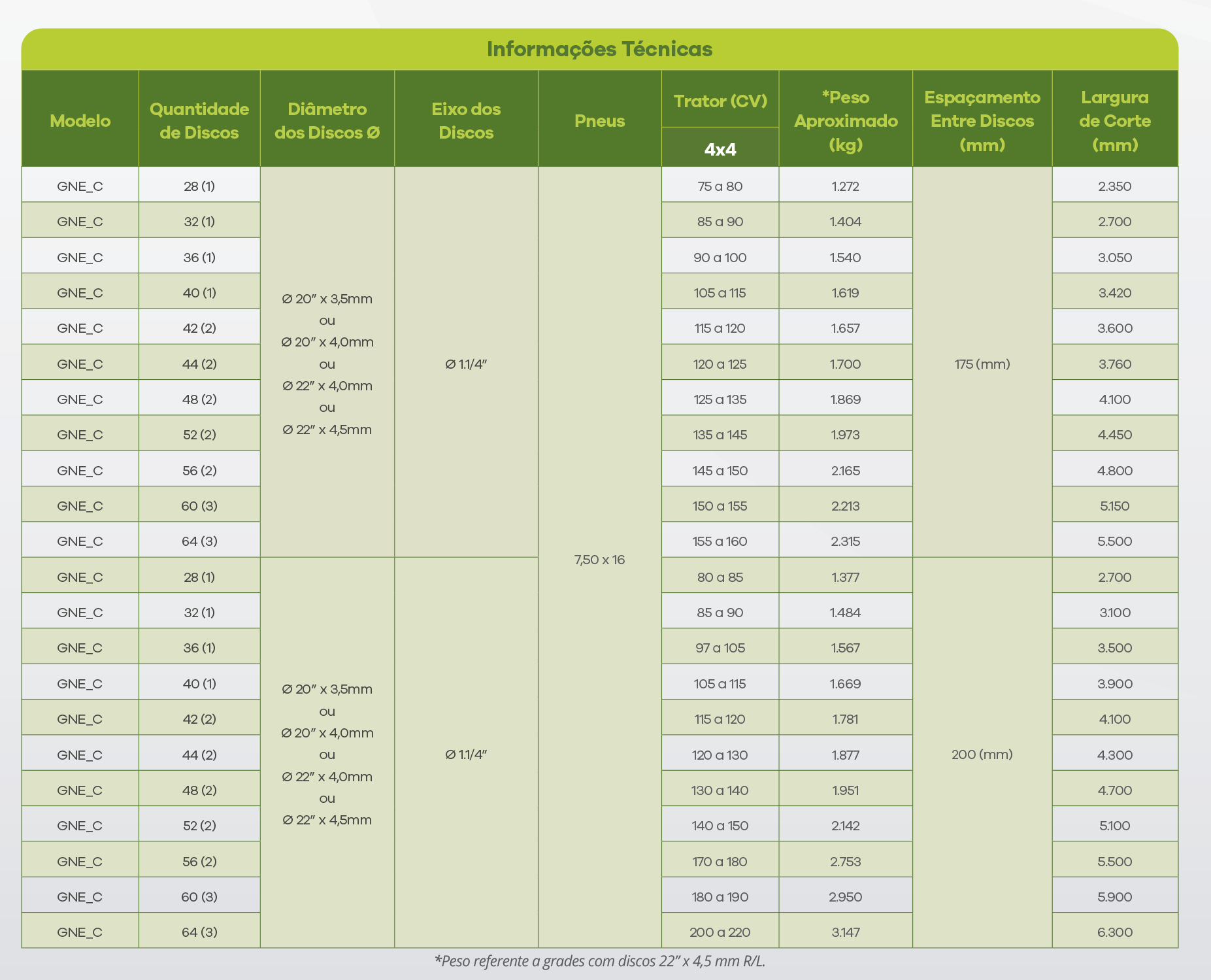 Visando oferecer mais uma opção de niveladora ao mercado, desenvolvemos mais uma grade derivada da família GNE, que é campeã em vendas, desta vez num formato mais compacto, justamente para proporcionar uma maior amplitude de aplicação x potência de tratores. A Grade Niveladora Compacta modelo GNE_C, realiza o processo de destorroamento, nivelamento e um excelente acabamento do ciclo de preparo do solo, permitindo assim que as demais operações como plantio e posterior colheita mecanizada, possam ocorrer com o máximo de eficiência. O conjunto do rodado pneus 6,00×16 (28 A 44 discos), pneus 7,50X16 (48 a 56 discos) e pneus 11L15 (60 a 64 discos), acionados via comando hidráulico, direto da cabine do trator (controle remoto), para realizar o transporte com a maior praticidade possível.