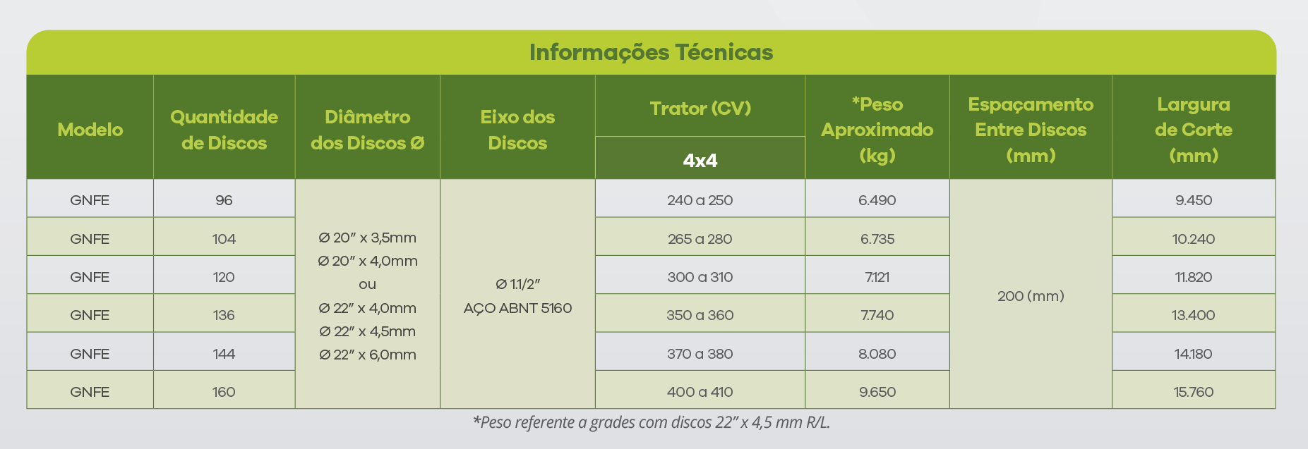 A Grade Niveladora modelo GNFE oferece 96 a 160 discos (Com Tandem). Com grande largura de corte este equipamento proporciona um alto rendimento e dinâmica na operação, onde sua estrutura é fabricada através de cantoneiras que proporcionam uma maior resistência em seu conjunto por completo. A GNFE garante excelente desempenho no destorroamento, nivelamento e bom acabamento do ciclo de preparo do solo, permitindo, assim, que as demais operações, como plantio e posteriormente a colheita mecanizada possam ocorrer com o máximo de eficiência. Com discos recortados na seção dianteira e lisos na seção traseira (Opcional), confere um melhor acabamento do solo.