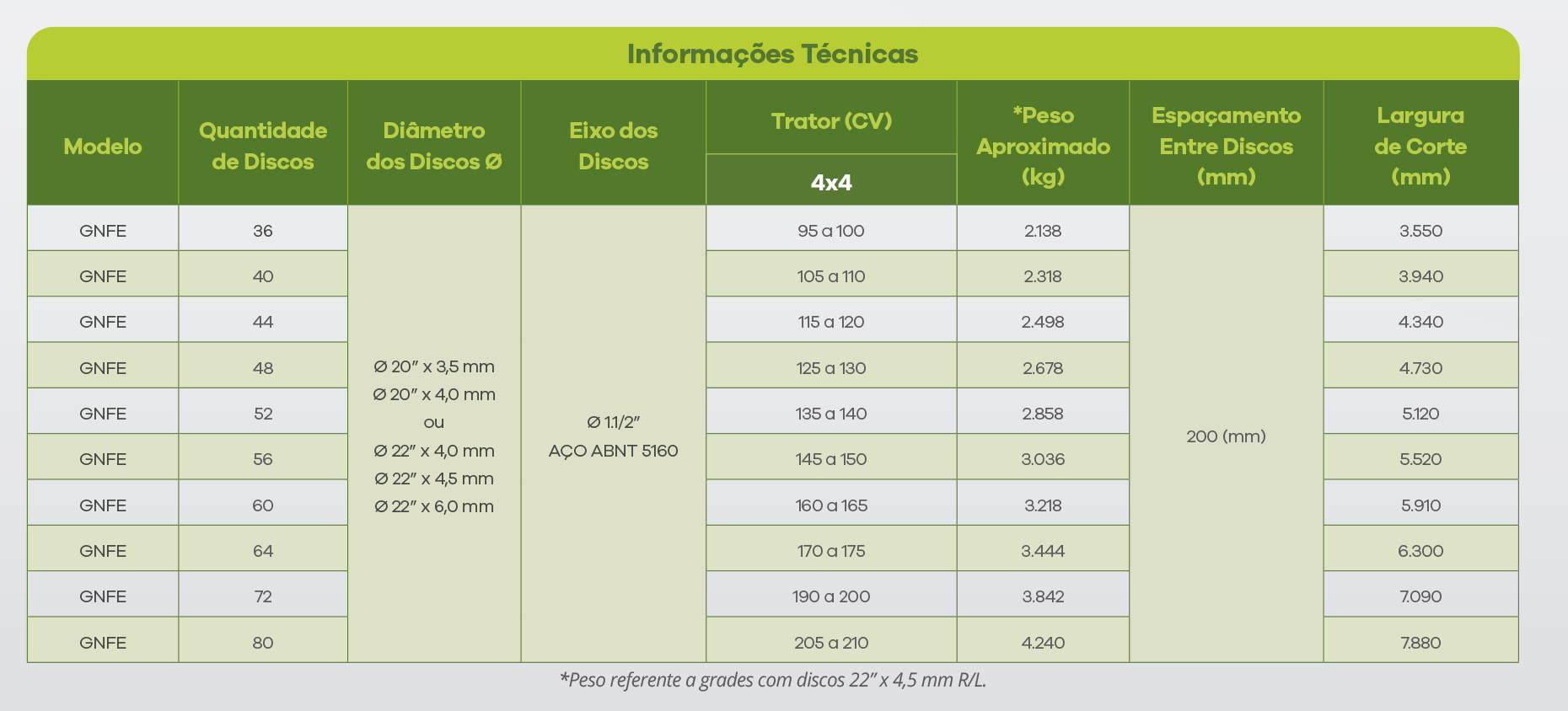 A Grade Niveladora Flutuante é fabricada nos tamanhos 36 a 80 discos, sem tandem, com opcional de discos recortados na seção dianteira e lisos na seção traseira, que conferem melhor acabamento do solo. A GNFE garante excelente desempenho no destorroamento, nivelamento e bom acabamento do ciclo de preparo do solo, permitindo assim, que as demais operações, como plantio e posterior colheita mecanizada, possam ocorrer com o máximo de eficiência.