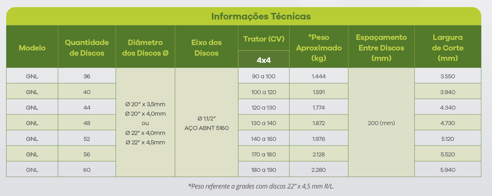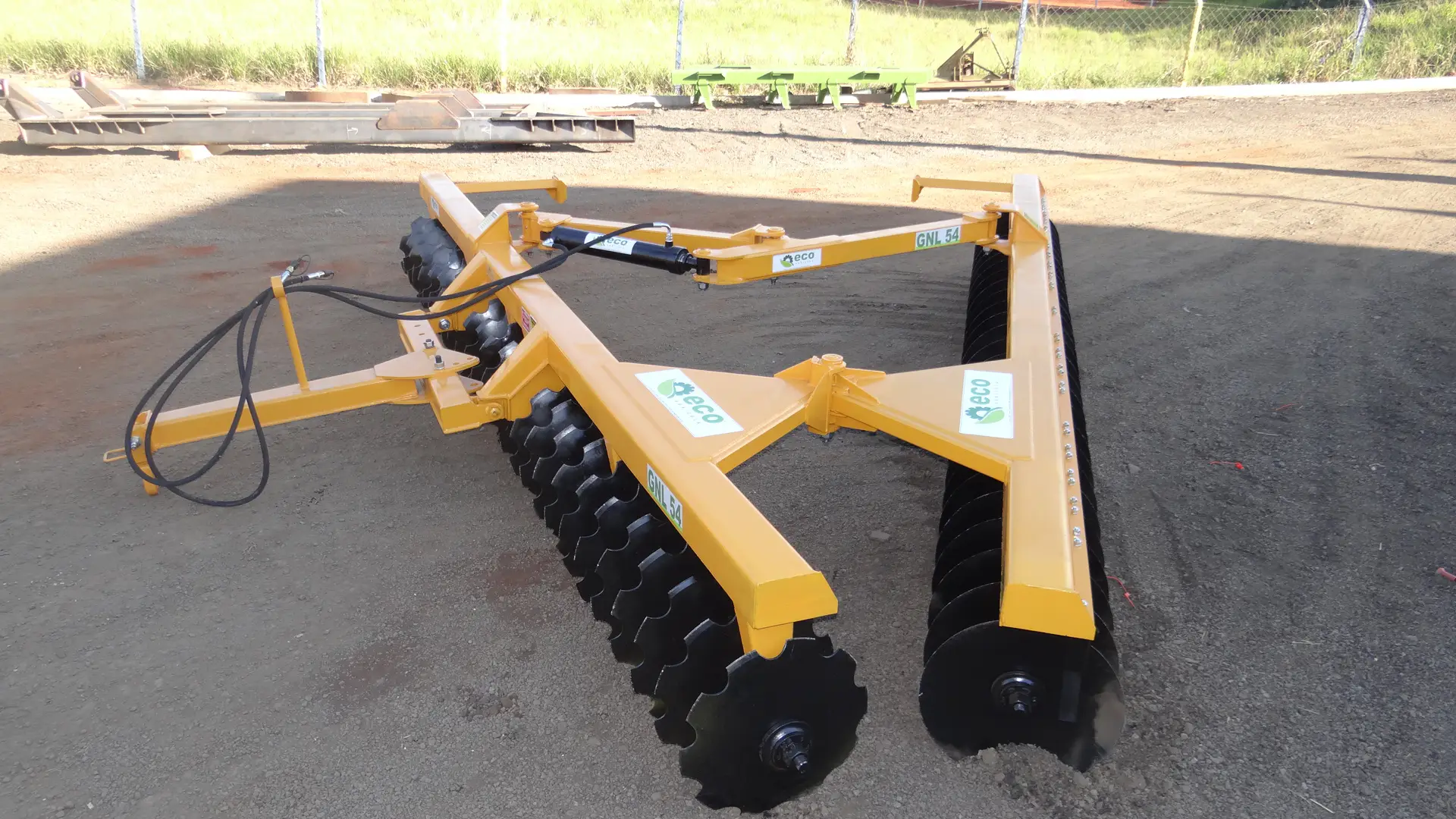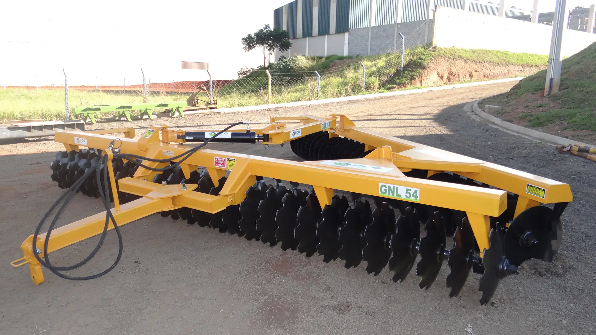 A Grade Niveladora GNL, foi desenvolvida para garantir o destorroamento, nivelamento e bom acabamento do ciclo de preparo de solo, permitindo assim que as demais operações como o plantio e posteriormente a colheita mecanizada possa ocorrer com o máximo de efi ciência. Com discos recortados na seção dianteira e lisos na seção traseira (opcional), oferece um melhor acabamento de solo. Este modelo oferece ampla regulagem para ajuste de ângulo de corte da grade, com cilindro hidráulico ou mecânico. Os equipamentos nos tamanhos 36 a 54 discos, tem em sua confi guração os chassis sem articulação (rígido).