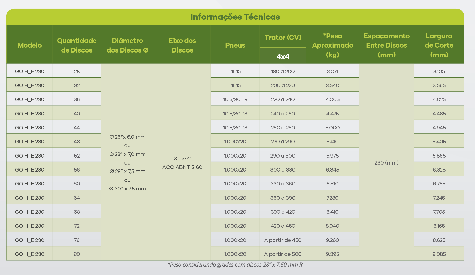 A Ecoagrícola visando o alto crescimento da vinda dos tratores de alta potência em âmbito nacional, desenvolveu uma linha especial de grades para atender esta nova tendência de preparo de solo. A Grade Off set Intermediária Hidráulica Especial (GOIH_230), pertence a uma família especial e inovadora de grades que tem como principais características: Robustez, Qualidade e Alto Desempenho. Suas atividades estendem-se para diversos tipos de operação, como: para aração em terrenos anteriormente cultivados com cereais, e/ou para utilização pós gradagem pesada em novas áreas ou canaviais, fazendo este trabalho com qualidade e perfeição. A abertura do ângulo de corte é feito através de cilindro hidráulico. Possui sistema de transporte inteligente com 2 pneus 11L15 (28 e 32 discos), 2 pneus 10,5/80-18 (36 a 44 discos), e pneus 1.000×20 (48 a 80 discos) acionados via comando hidráulico direto da cabine do trator. O cabeçalho possui sistema de articulação para facilitar o transporte. O deslocamento do equipamento é feito através do do rabicho do trator de forma angular, garantindo melhor efi ciência e praticidade nas manobras pela propriedade.