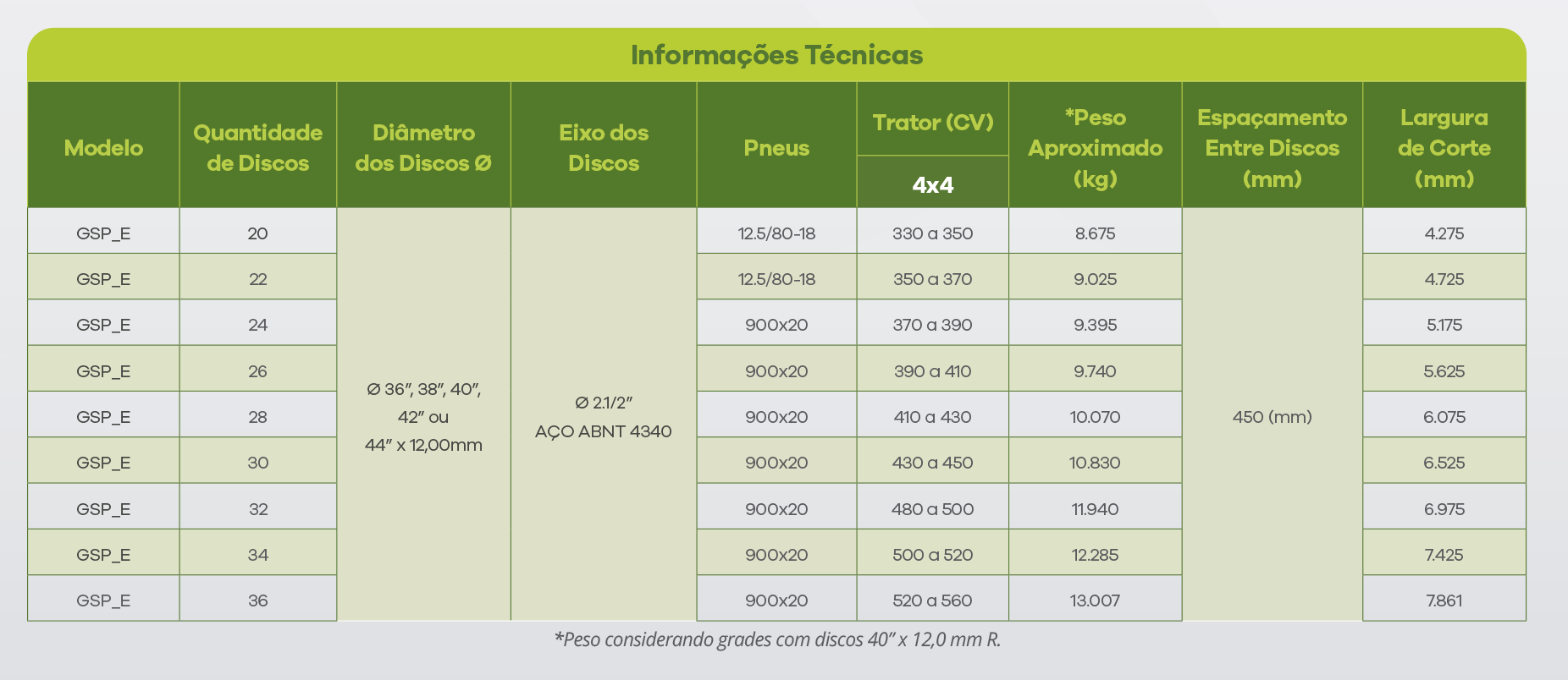 A Ecoagrícola visando o alto crescimento da vinda dos tratores de alta potência em âmbito nacional desenvolveu uma linha especial de grades para atender esta nova tendência de preparo de solo. A Grade Super Pesada Especial, GSP_E, pertence a uma família especial e inovadora de grades que têm como principais características: Robustez, Qualidade e Alto Desempenho. Suas atividades estendem-se para diversos tipos de operação, como: reforma e abertura de novas áreas, eliminação de ervas daninhas, quebra de torrões, incorporação de palhada ao solo, entre outras atividades. O conjunto de rodado é composto por 4 pneus acionados por comando hidráulico direto da cabine do trator (controle remoto).