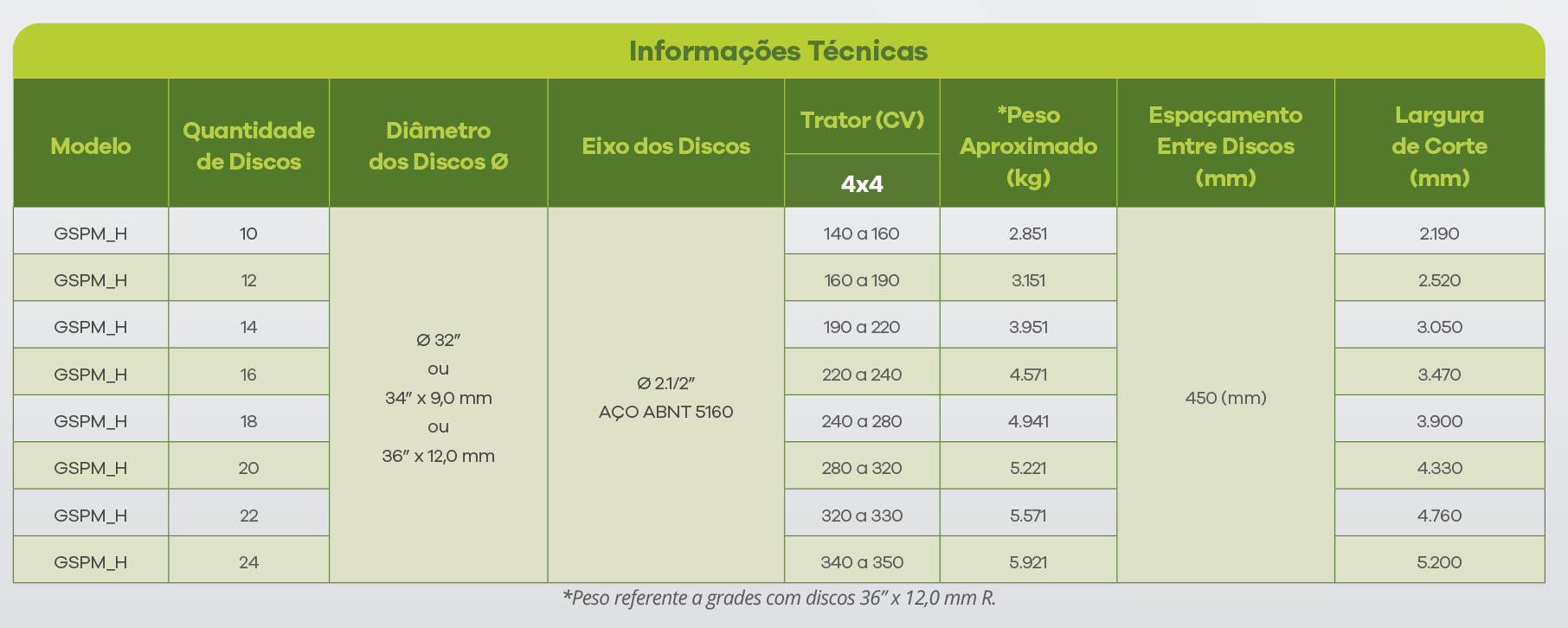 A Grade Super Pesada com Abertura Mecânica ou Hidráulica (GSPM_H), foi projetada para ser utilizada no primeiro estágio da preparação do solo, abertura de novas áreas e ou erradicação de cana-de-açúcar. Devido as condições severas e pesadas de trabalho as quais são destinadas, este modelo oferece duas opções para ajuste de ângulo de corte da grade, com cilindro hidráulico ou mecânica.