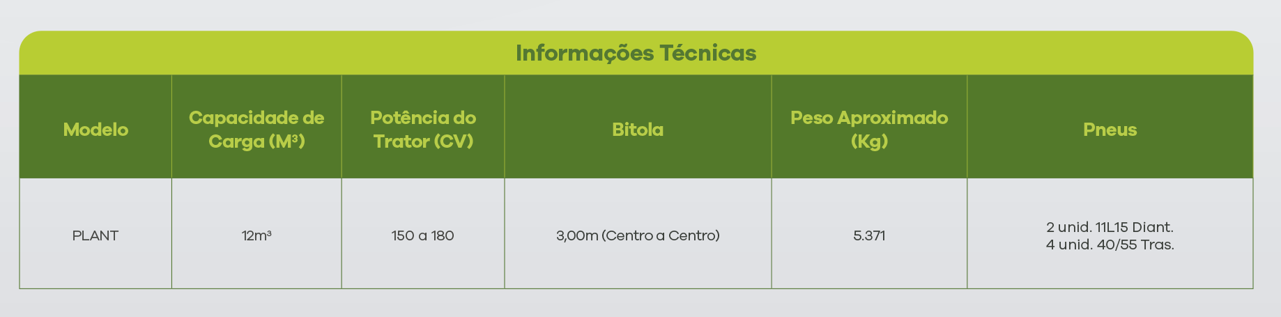 Utilizado geralmente para plantio de inverno, época que e mais comum utilizar composto orgânico no sulco de plantio. O equipamento possui capacidade de carga para composto de 12 m³ (coroada), dois hastes sulcadores, quatro discos cobridores de 18” com mancais banhados a óleo com anéis de dupla vedação. Os depósitos de adubo químico tem capacidade de 300 kg cada um, possui um motor hidráulico para cada esteira de distribuição e outro motor individual para o adubo. As comportas de regulagem de distribuição do composto são feitos por um fuso tensor proporcionando uma regulagem mais precisa, o equipamento também possui comportas em suas laterais para facilitar a limpeza e manutenção.
