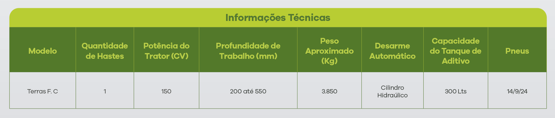 O Aplicador de Insumos Florestal EcoAgrícola tem a função de atuar na linha onde o subsolador já realizou o trabalho de descompactação e preparo do solo, realizando a adubação química através de uma haste a uma profundidade de 300 a 350 mm.